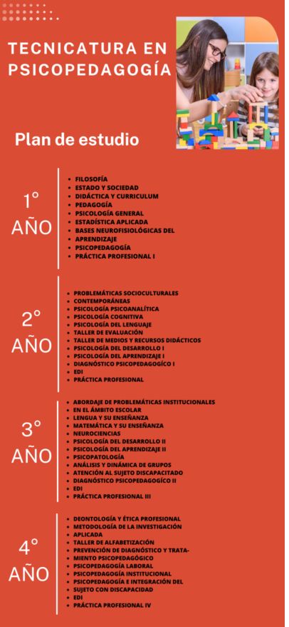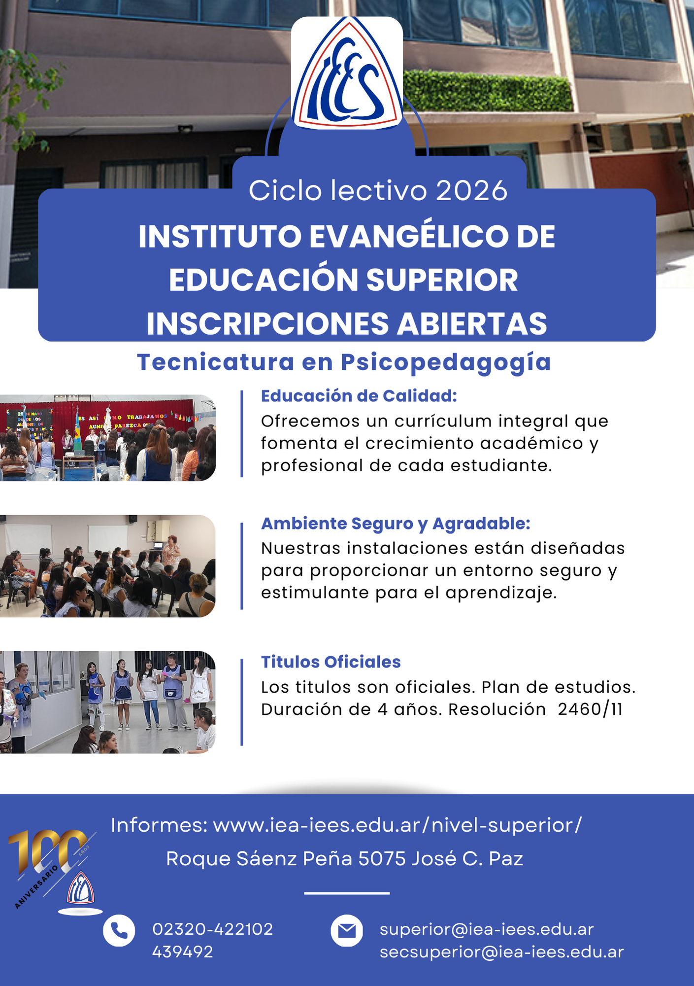 Nuestro Nivel Superior ofrece para el ciclo lectivo 2026 la carrera oficial de Tecnicatura Superior en Psicopedagía. El horario de la cursada es de Lunes a Viernes de 18 a 22 horas, presencial y tiene una duración de 4 años. La residencia en el Nivel Superior dura aproximadamente dos cuatrimestres.