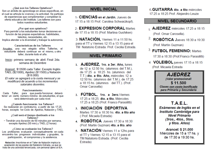 Costo: Los Talleres Optativos tienen un costo adicional que se incorpora al arancel mensual escolar, bajo el rubro «Taller Optativo». Los valores son diferenciales en función de la carga horaria de cada Taller.